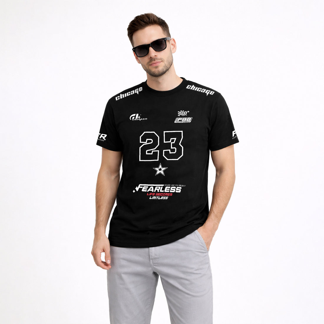 Step into bold style with this Black Tee 23 Chicago Theme Fearless Graphic tee. Featuring...