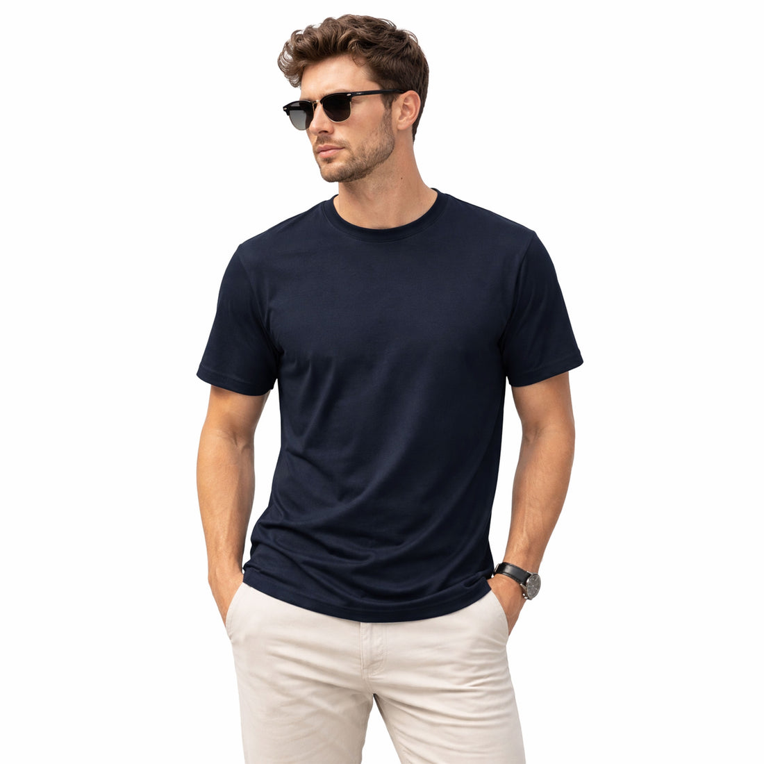 Elevate your everyday basics with this sharp navy crew neck tee—the ultimate wardrobe MVP that...