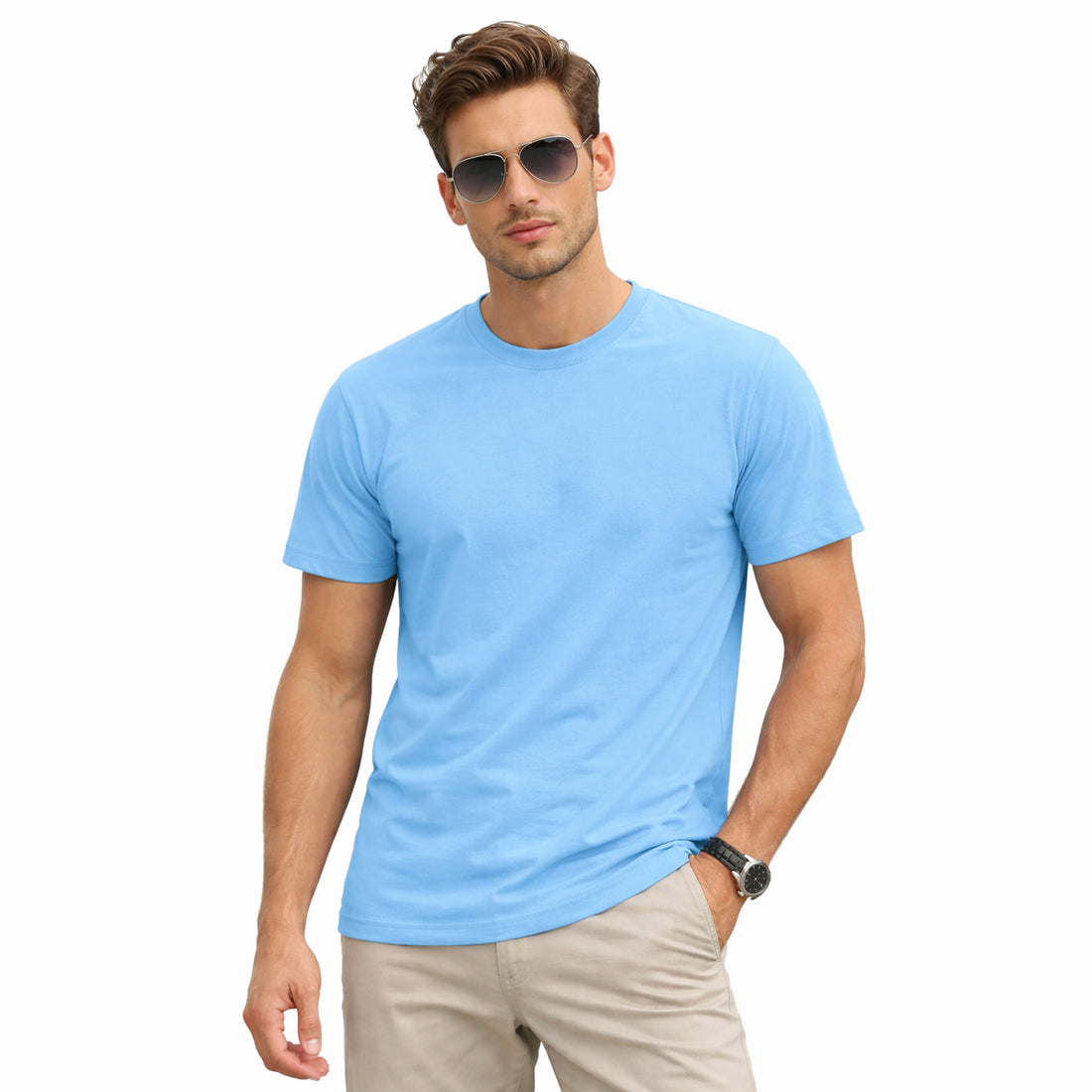 Elevate your casual wardrobe with this crisp sky blue crew neck tee—the perfect go-to piece...