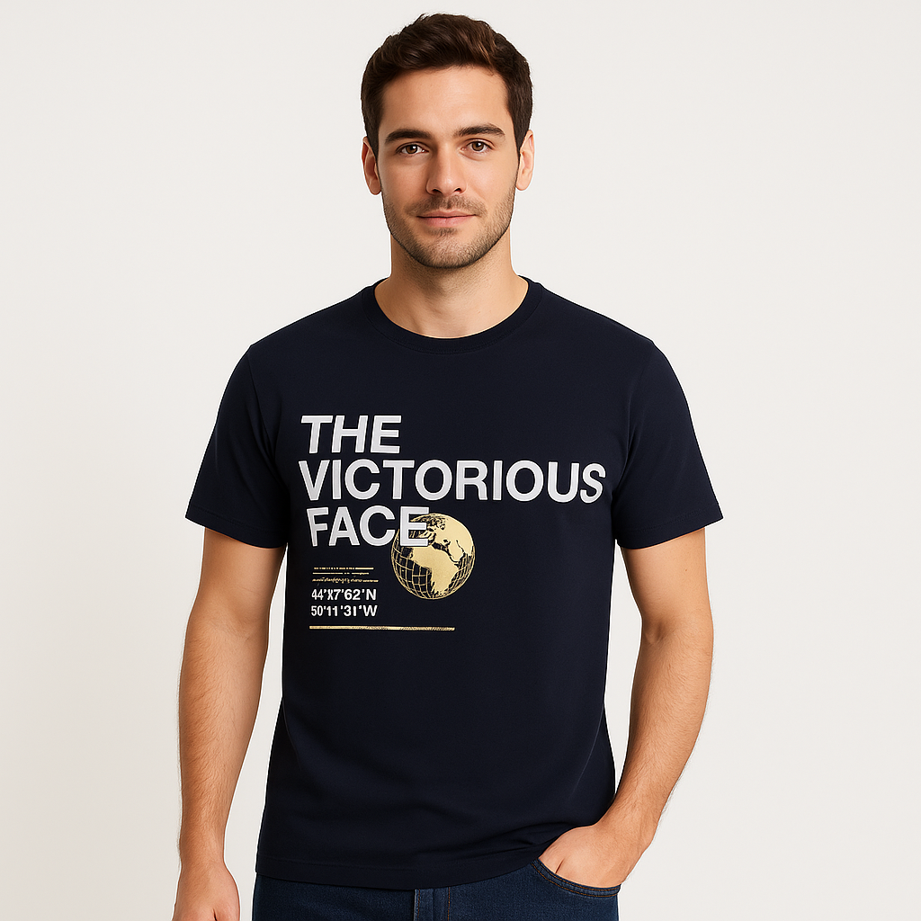 This T SHIRT features a bold print of a victorious face, representing strength and determination....