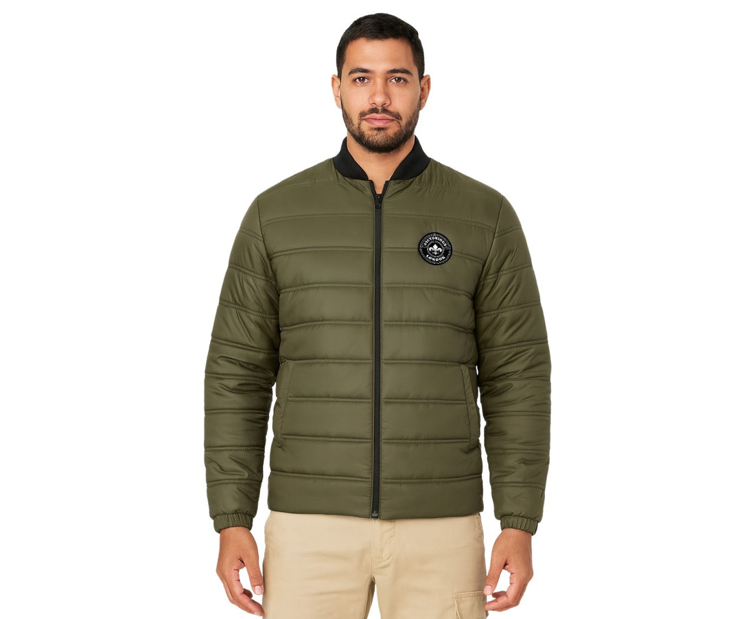 Stay cozy and cool in this Men's Olive Green Zip-Up Puffer Jacket! Its snug fit...