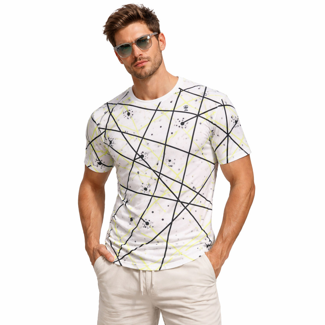 Own your workout in this crisp white crew neck tee with an eye-catching all-over print...
