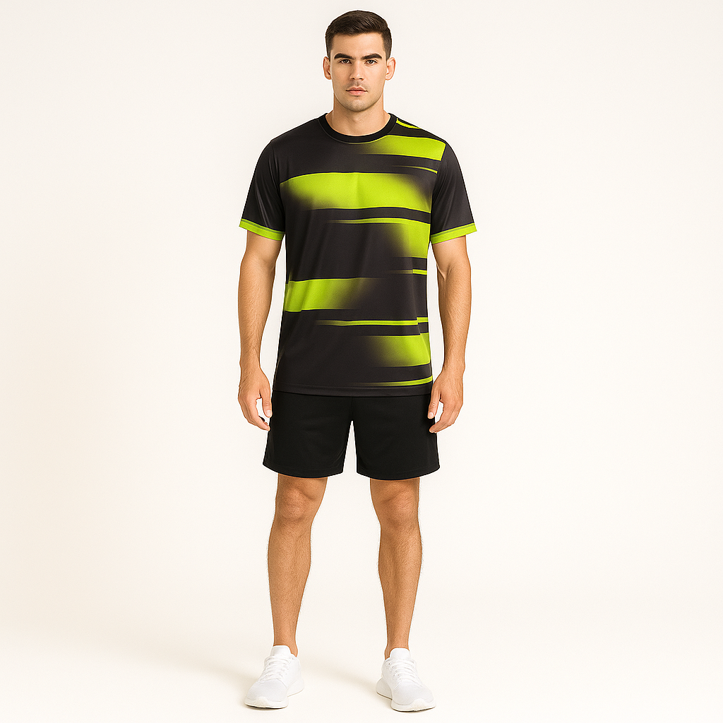 MEN POLYESTER BLACK AND YELLOW ALL OVER PRINT SPORTS SHORT TRACKSUIT