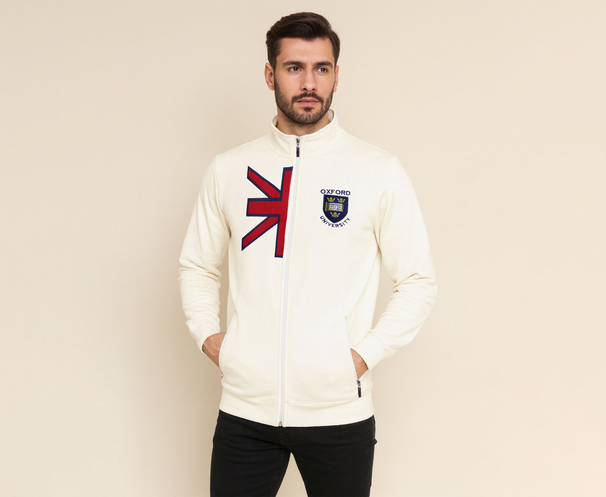 Show off your quirky side with this playful full-zip jacket featuring a bold half Union Jack design paired with the iconic Oxford University badge. Perfect for adding a splash of British charm to your look while staying comfy and casual all day long!