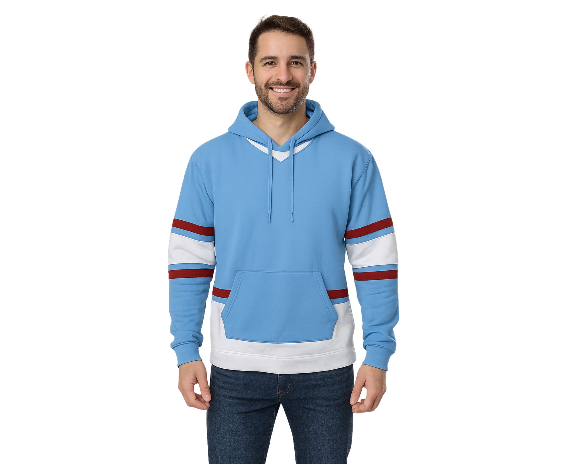 Men’s Light Blue Hoodie with Red & White Stripe Panels