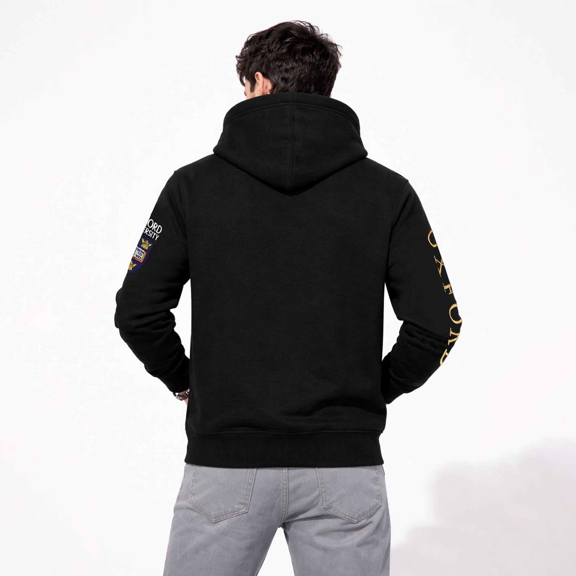 Elevate your casual wardrobe with this striking black zip-up hoodie, featuring sophisticated Oxford University–style crests and intricate embroidery that adds character and prestige. Crafted for comfort and style, this premium piece works perfectly for layering or standing alone. The classic black hue pairs effortlessly with any outfit, while the detailed embroidered accents give you that intellectual, refined edge. Whether you're channeling academic vibes or just want to look sharp, this hoodie delivers both warmth and personality in one dapper package.