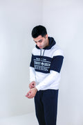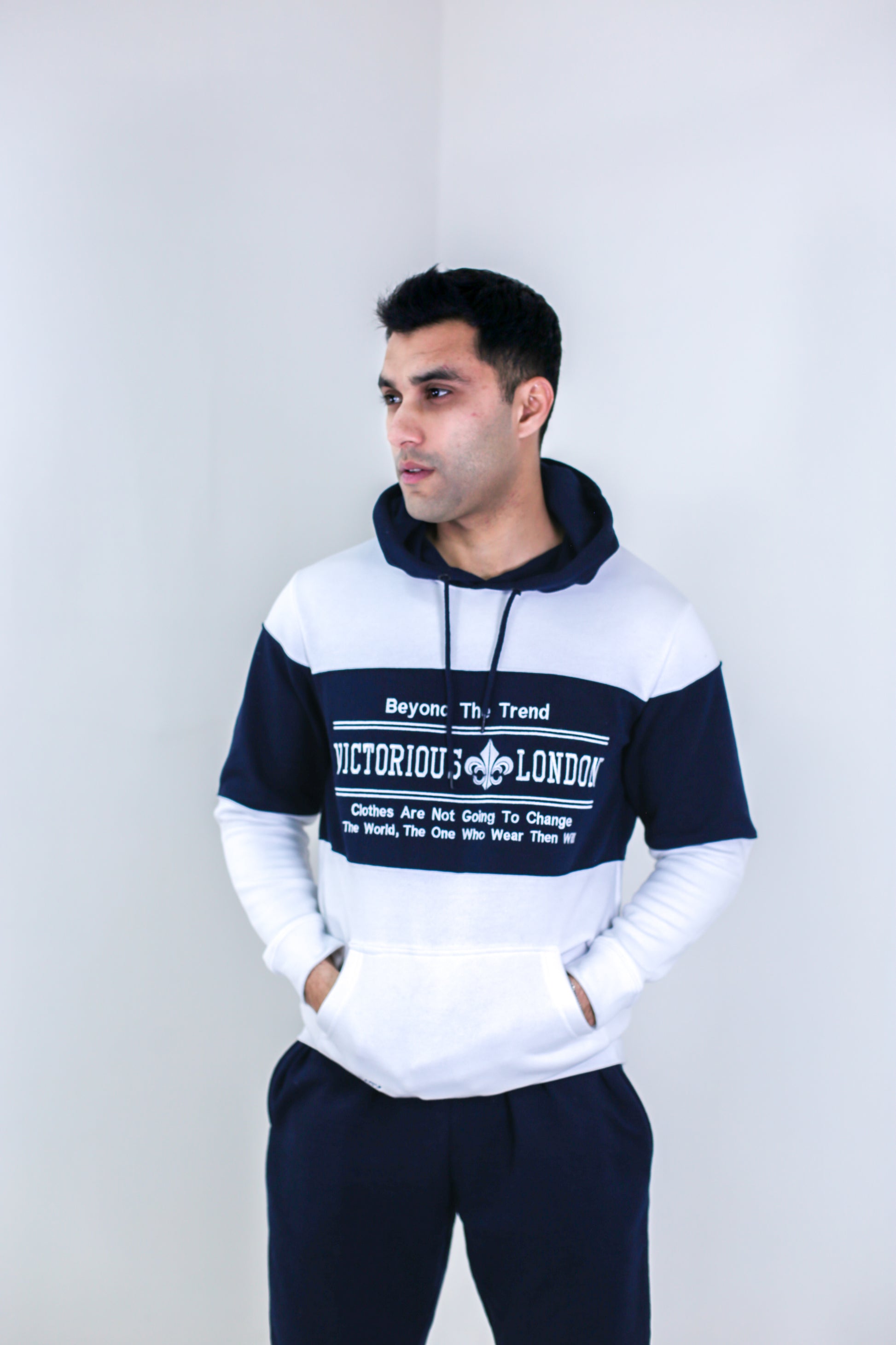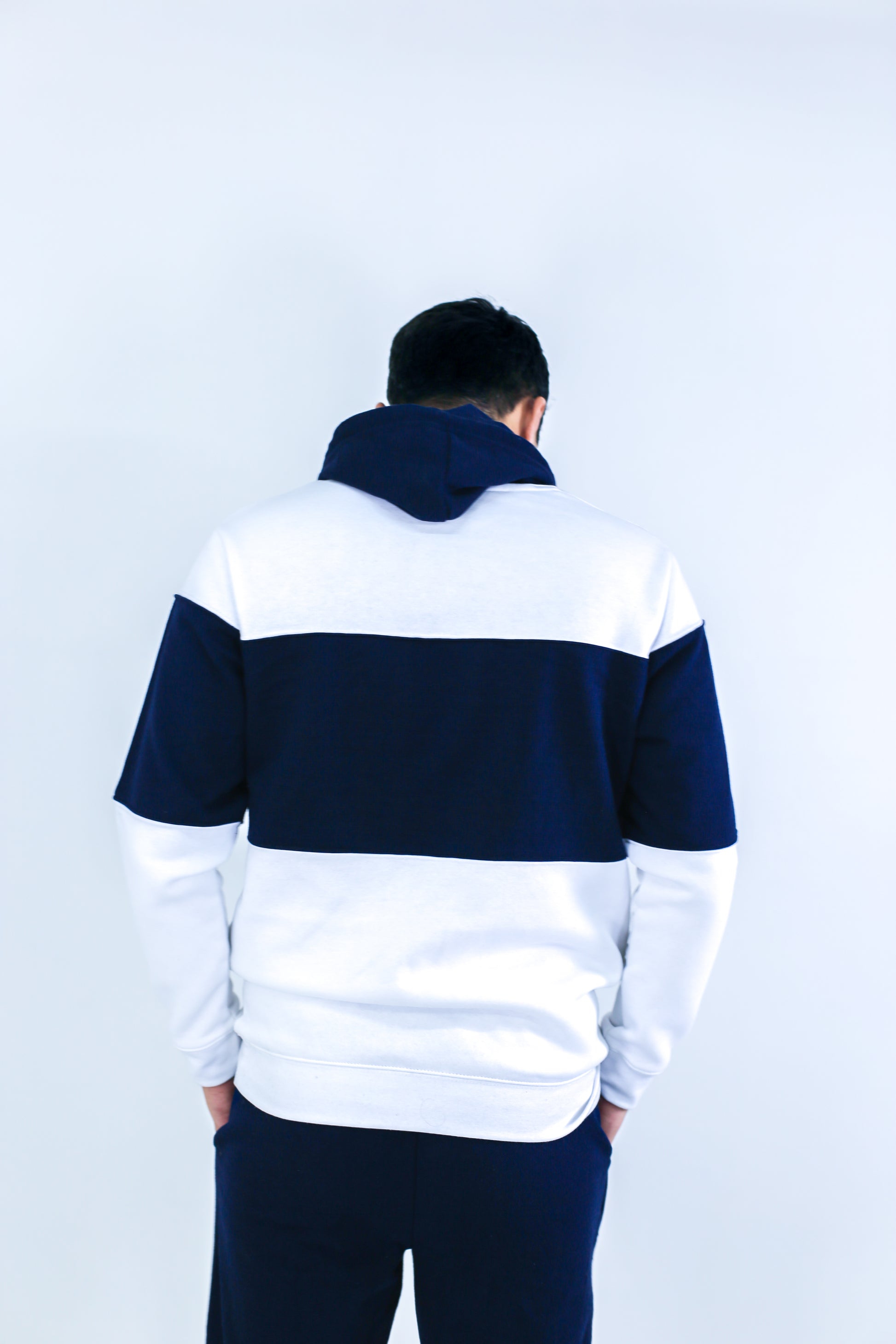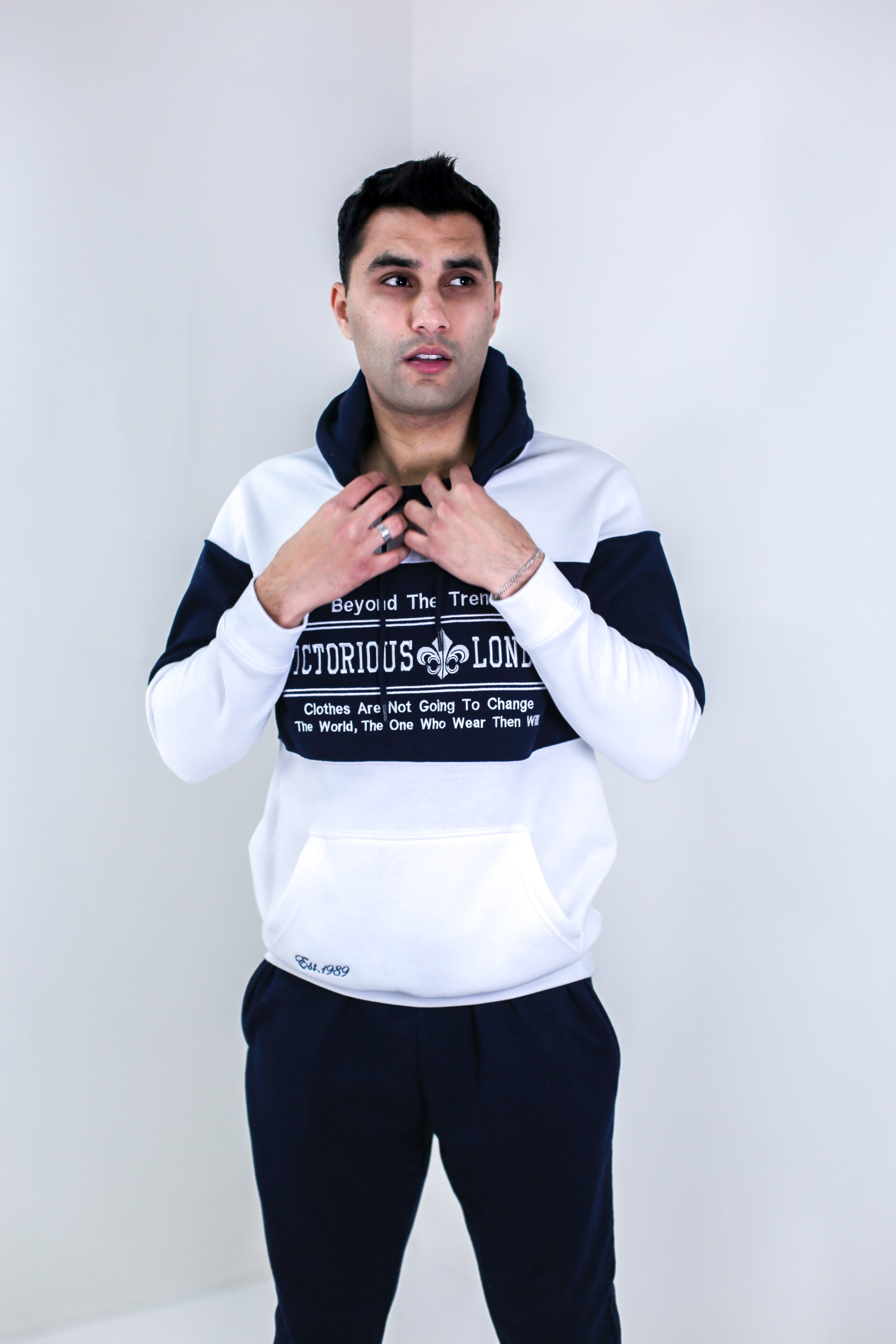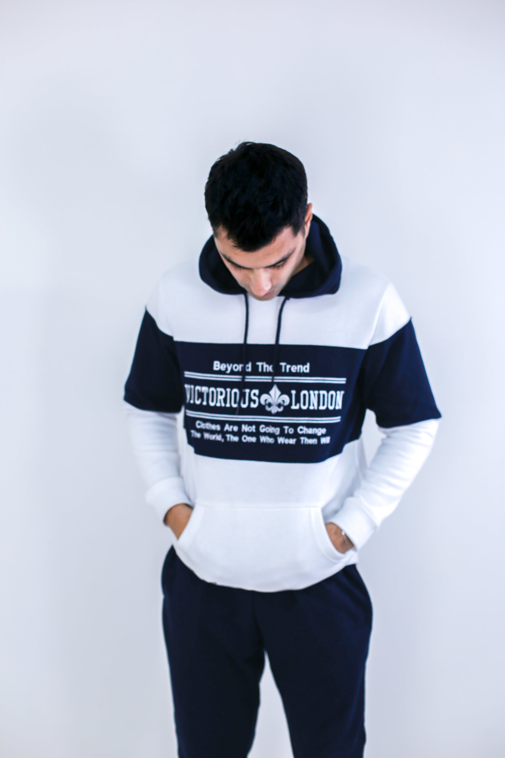 Elevate your loungewear game with this striking white and navy tracksuit that's anything but basic. Featuring bold contrast panels and intricate embroidery detailing, it's the perfect blend of comfort and style. Whether you're running errands or keeping it cozy at home, this two-piece set delivers effortless sophistication with a fun twist. The crisp color blocking makes it versatile enough to dress up or down, while the quality construction ensures it'll be your go-to favorite for seasons to come.